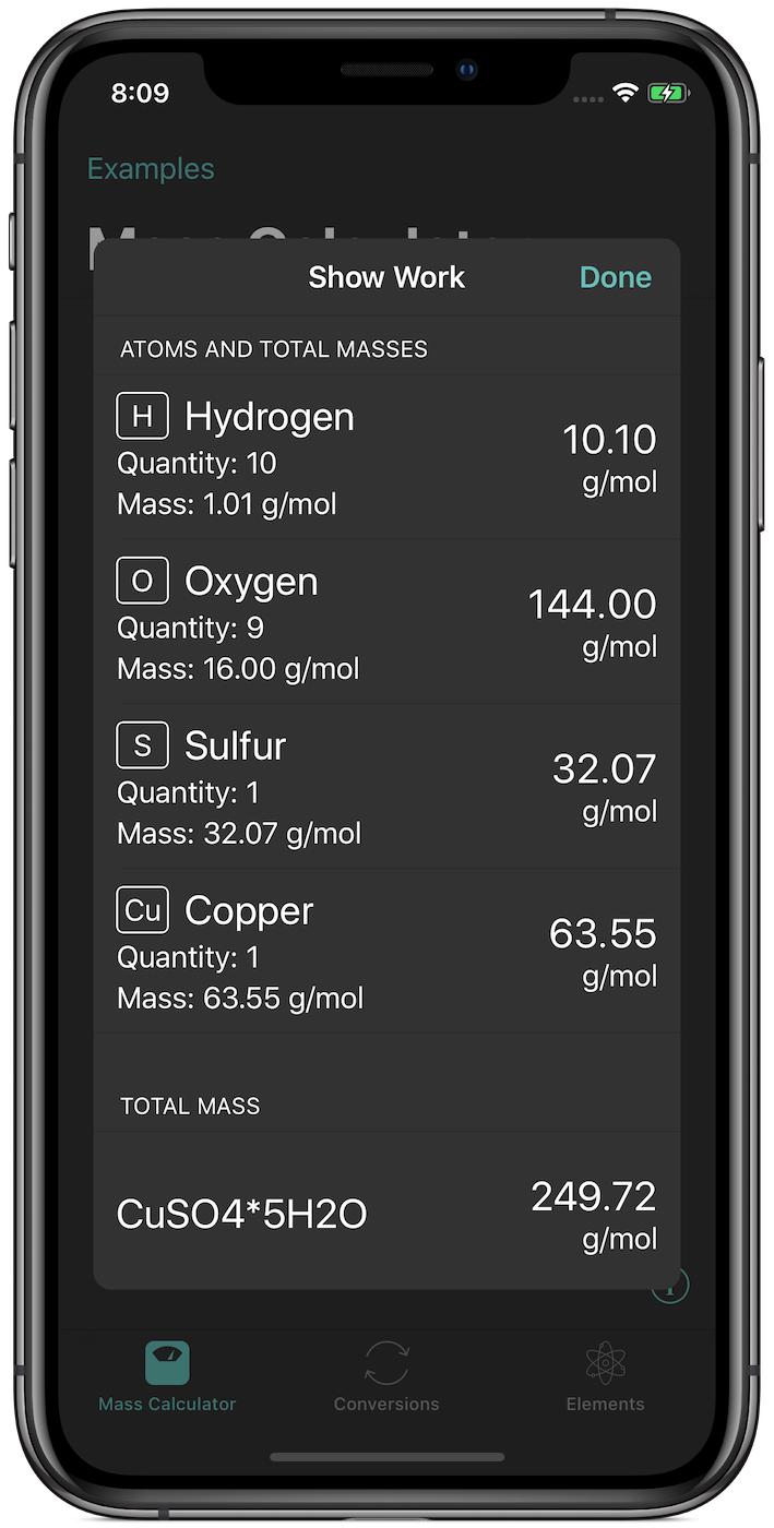 Tired of wasting your time doing boring calculations during chemistry labs? Then ChemWhiz is the app for you. Quickly find the molar mass of any chemical simply by typing its formula. Convert between common units like moles, liters, and grams. And view at-a-glance information about every element in the periodic table.