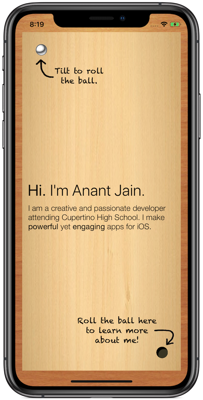 Inspired by my favorite childhood toy, my WWDC 2015 app operates like a wooden labyrinth. Simply tilt the device to roll the steel ball around and navigate through the app, all while learning about me and my background. Apple, Inc. recognized my submission as a perfect blend of the arts and sciences, granting me a free ticket to attend WWDC 2015 and recognizing me as one of the top 350 student developers across the globe.